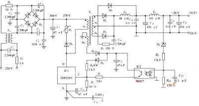 該開(kāi)關(guān)電源的規(guī)劃方針是安穩(wěn)20 V輸出,輸出電流0~2 A可變,用于音響系統(tǒng)。為了突出降低電磁噪聲的處理技能,簡(jiǎn)化電路,用單片開(kāi)關(guān)電源芯片TOP224Y進(jìn)行規(guī)劃。TOP224Y內(nèi)部已包含了PWM調(diào)制所需的所有電路以及鼓勵(lì)管輸出,由它鼓勵(lì)變壓器,開(kāi)關(guān)頻率為100 kHz,內(nèi)部MOS鼓勵(lì)管的耐壓為700 V,輸出功率小于45 W。電路如圖1所示,該電路能夠獲得更大的輸出功率,只需更改部分器件。圖1中左邊的電路R1,L1,D1,C1至C7是慣例的共模濾波和整流電路,獲取約300 V的直流電壓供DC-DC改換電路運(yùn)用;最右邊電路L5,C11等是一般的LC濾波電路;IC2,D8,R9,R10組成電壓反應(yīng)電路,構(gòu)成閉環(huán)結(jié)構(gòu),安穩(wěn)電源輸出電壓;中間部分是DC-DC改換器,降噪聲的關(guān)鍵是對(duì)這一部分的電路進(jìn)行適當(dāng)處理。